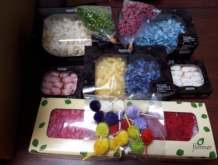 母の日のプレゼント用にハーバリウムとアロマワックスサシェ&カップを製作しています。